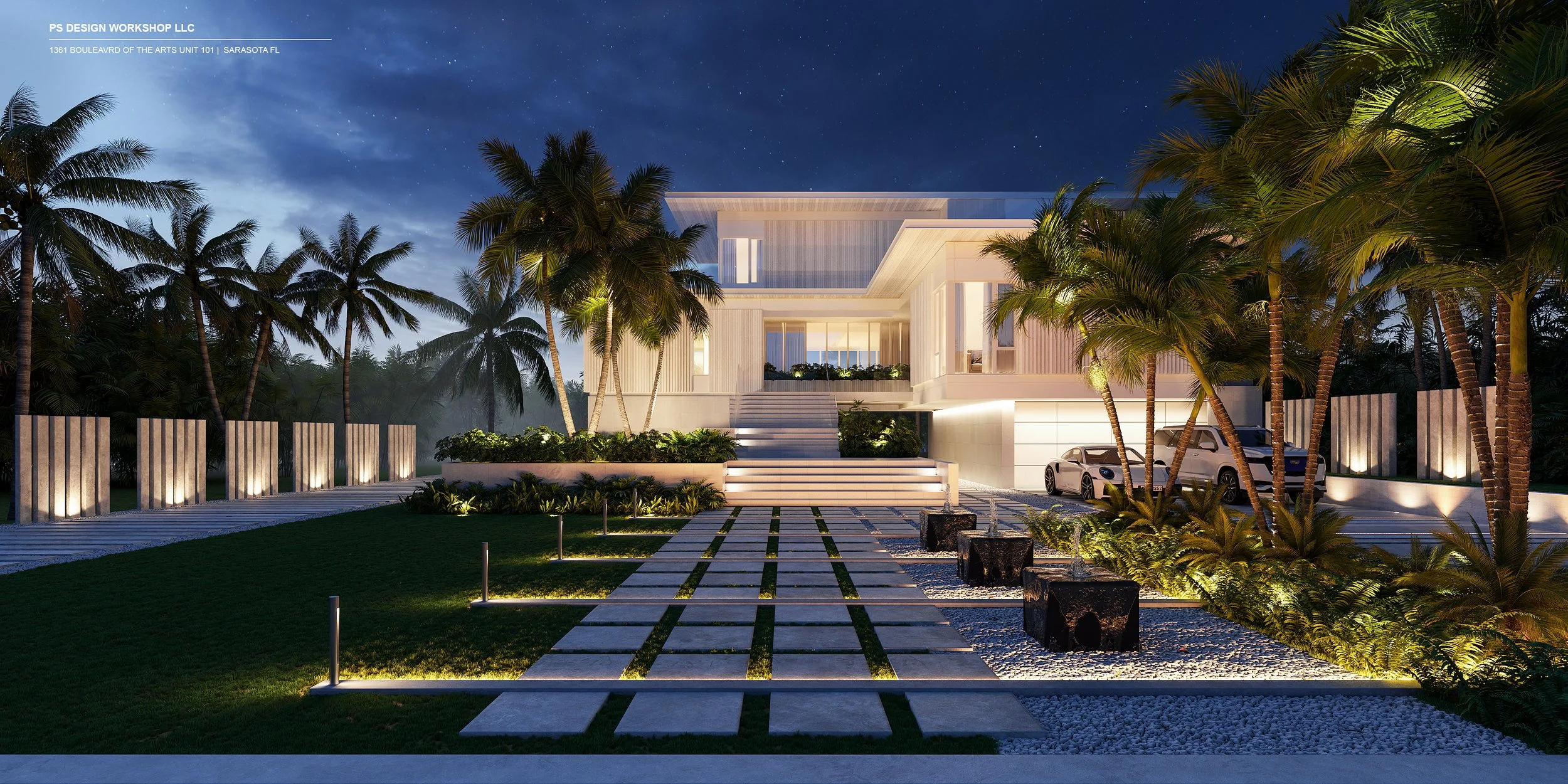 The waterfront of the home will have amenities such as a pool, hot tub, fire pit area and other lounge features. The home will also incorporate such elements as certain internal and external relationships as well as a grand shaded pool deck space for entertaining and enjoying the Florida environment.